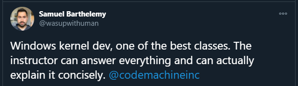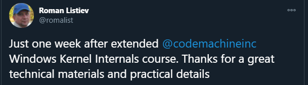 CodeMachine has been involved in Windows internals, development, and debugging since the inception of Windows NT in 1992 and has delivered related courses all over the world for more than 15 years. CodeMachine instructors bring unmatched historical perspective to design and architectural questions that come up during the training. Moreover, CodeMachine instructors actively work on Windows security software on a regular basis enabling them to convey real-life experiences to attendees. This depth of technical knowledge and architectural insights sets CodeMachine courses apart from other training providers.